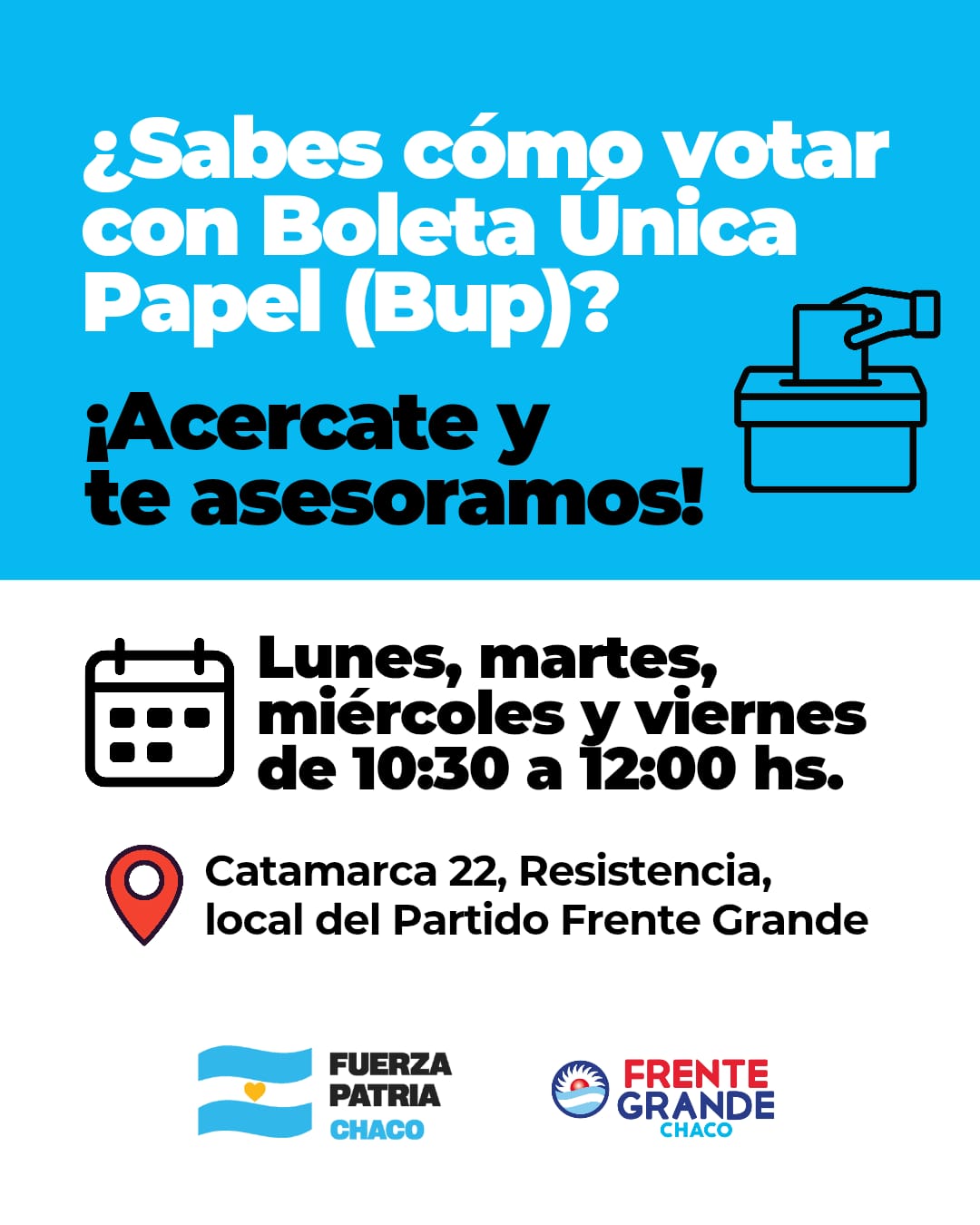 FRENTE GRANDE EN ACCIÓN ¿Sabes cómo votar con Boleta Única de Papel (BUP)?🙌🏼 PorEquipo Frente Grande 15 de octubre de 202520 de octubre de 2025 ¡Acercate y te asesoramos! Lunes, martes, miércoles y viernes de 10:30 a 12:00 hs. Catamarca 22, Resistencia, local del Partido Frente Grande